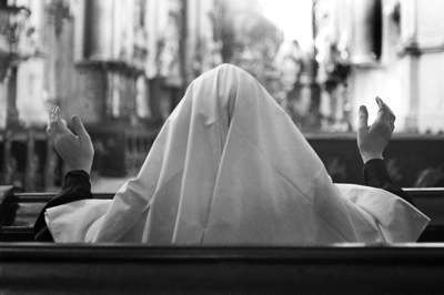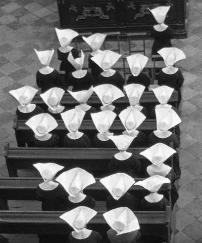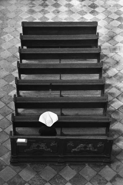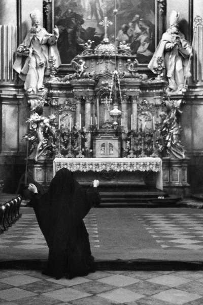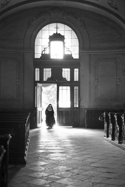 V laviciach sedelo viacero rehoľných sestier, pohrúžených do modlitieb. Jedna kľačala pred oltárom a modlila sa s naširoko roztiahnutými rukami.
